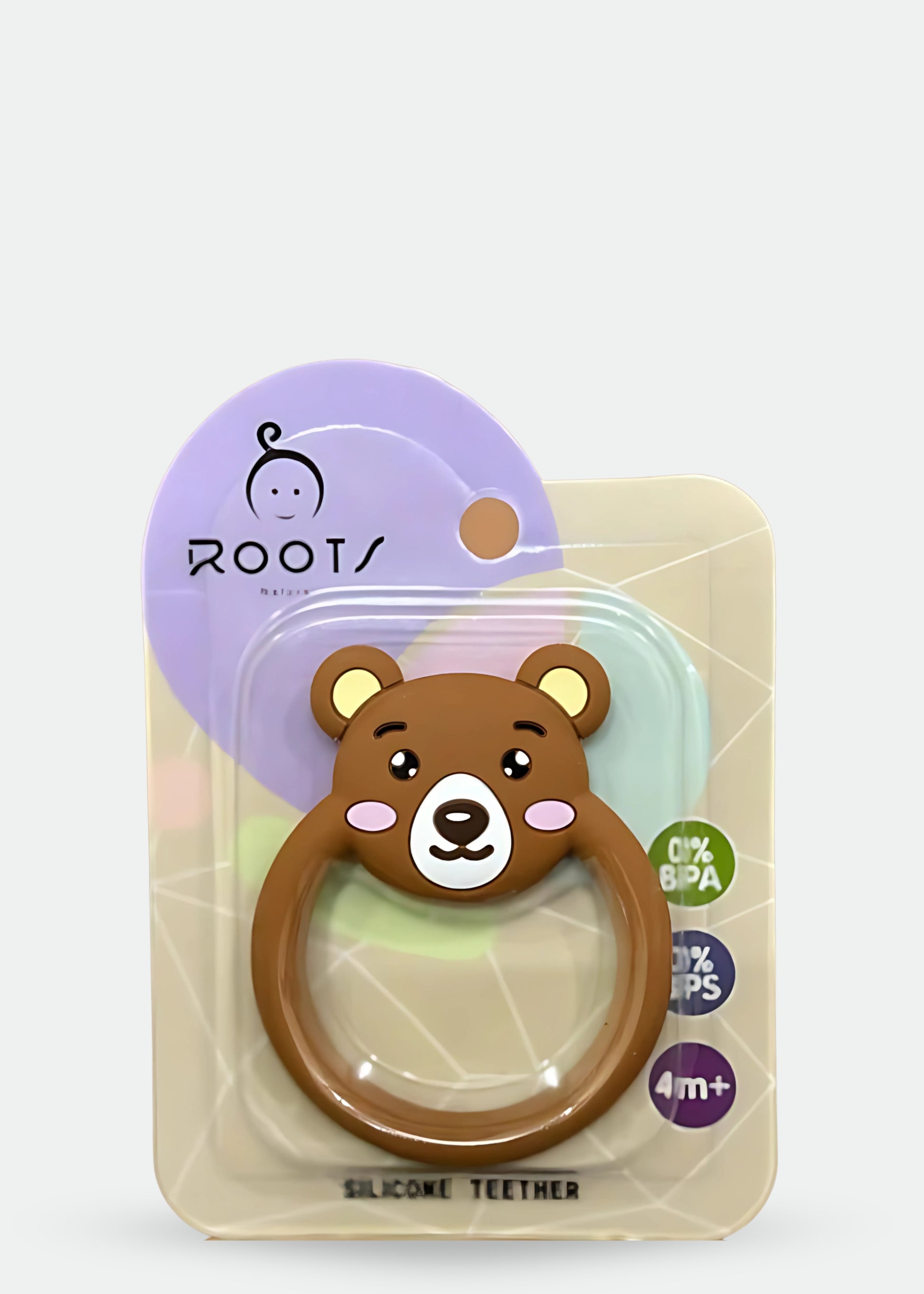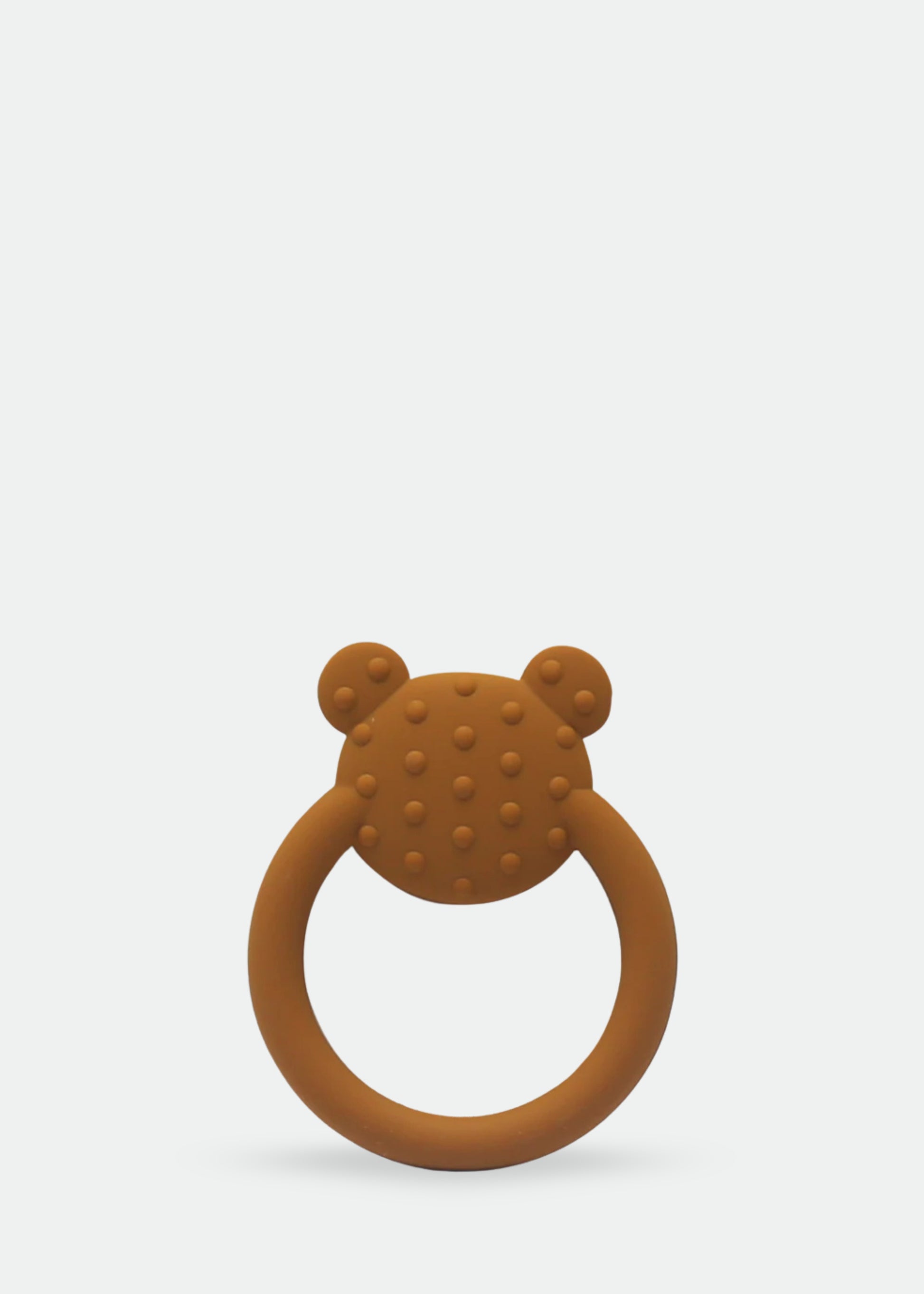 This silicone teether is designed to help babies get used to chewing on something other than their gums. It has a cute bear face design, making it look like a toy.